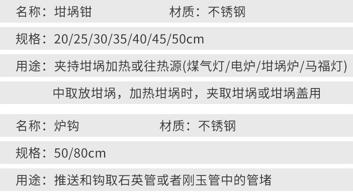 產(chǎn)品概述:高品質(zhì)不銹鋼坩堝鉗、爐鉤