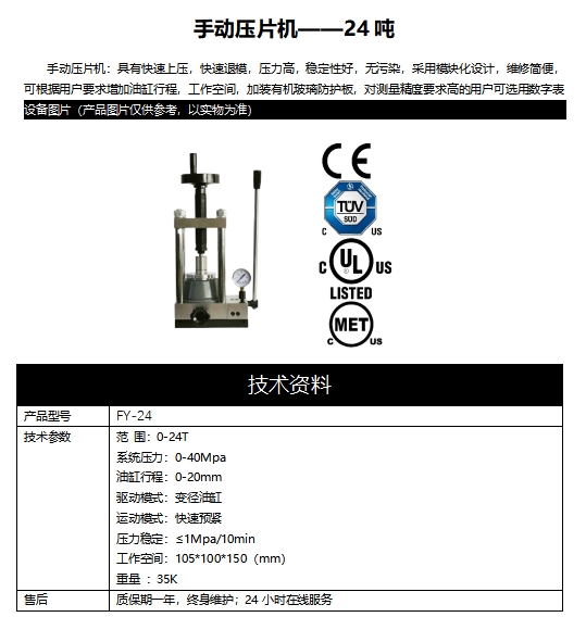 手動壓片機:具有快速上壓,快速退模,壓力高,穩(wěn)定性好,無污染,采用模塊化設計,維修簡便,可根據(jù)用戶要求增加油缸行程,工作空間,加裝有機玻璃防護板,對測量精度要求高的用戶可選用數(shù)字表